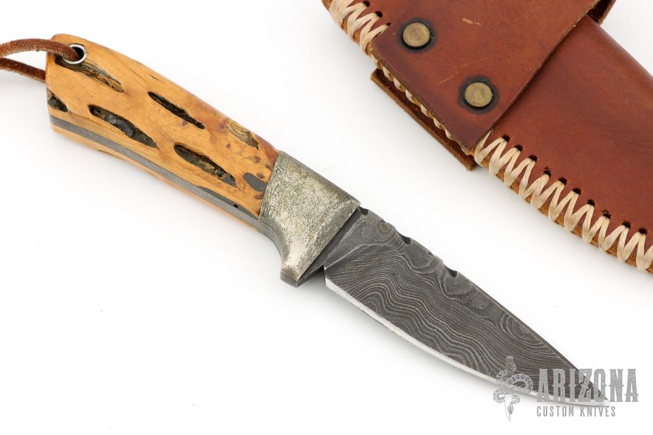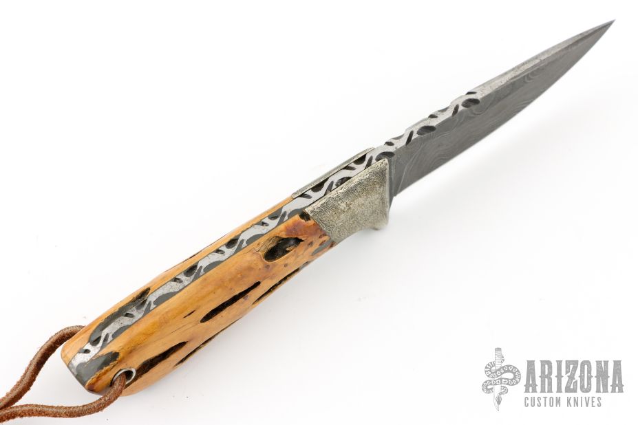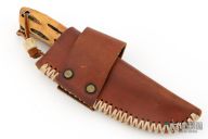 This knife (please let us know if you know who this maker is) features a Damascus blade with fileworked spine, .168" blade stock and 1.065" blade depth, full tang construction. The handle has stippled nickel silver bolsters, stabilized cactus wood scales with a lanyard hole. Fileworked tang. Comes with a brown leather sheath. Has some light patina, otherwise excellent condition.