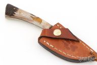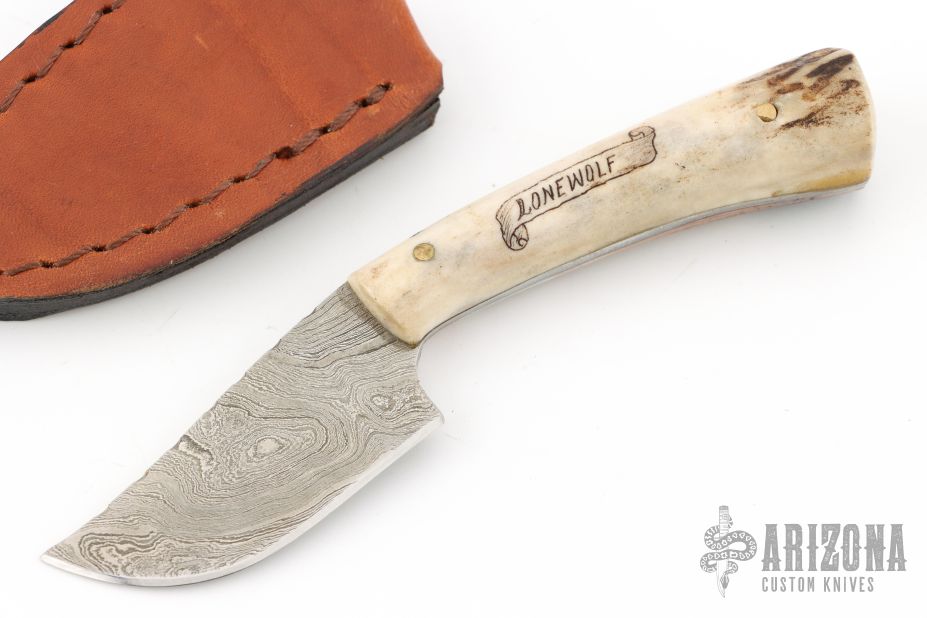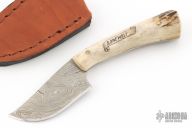 This Skinner by JA Lonewolf features a Damascus blade with fileworked spine, .083" blade stock and 1.070" blade depth, full tang construction. The handle has scrimshawed stag scales. Comes with a brown leather neck sheath. There is an eagle scrimshawed onto one side of the handle; Lonewolf is scrimshawed onto the other side of the handle. Has some mild separation between one of the scales and the tang, otherwise excellent condition.