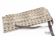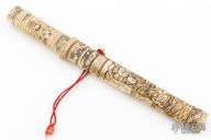 This Tanto features a satin finished blade with .096" blade stock and .663" blade depth. Brass habiki. The handle and saya are matching carved bone. Fittings are loose, blade shows scratches, rust, and patina, bone has some dings and dents, good condition otherwise. The saya has a break in the middle. The listing includes a sword bag.