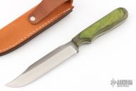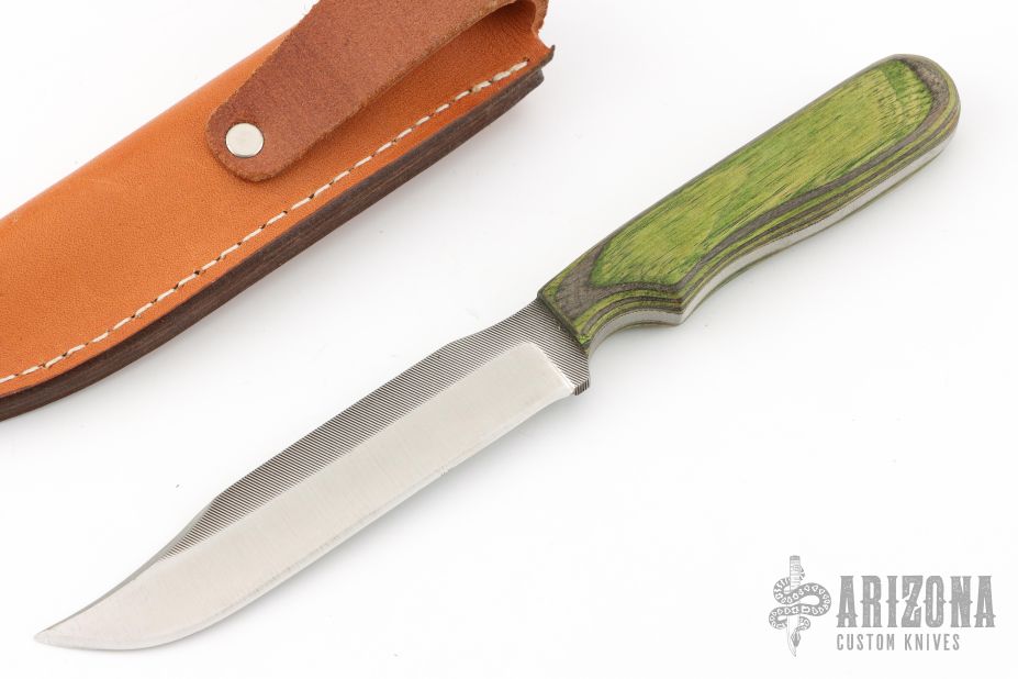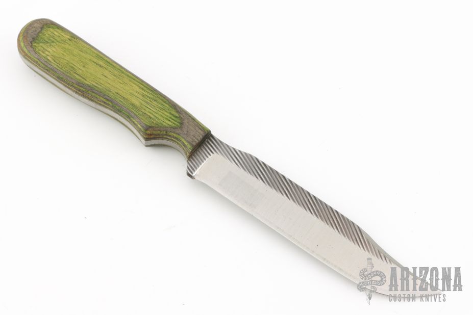 This Bowie by Anza Knives features a blade made from a file, dymondwood scales with .161" blade thickness and .925" blade depth, full tang construction. Comes with a brown leather sheath. Excellent condition. Dated '06