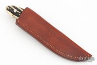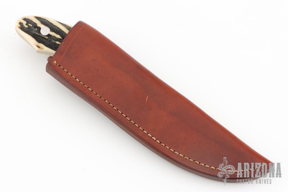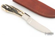 This Skinner by the late George Herron features a mirror finish blade with .124" blade stock and .874" blade depth, full tapered tang construction. The handle has stainless steel bolsters with stag scales. Comes with a brown leather sheath and zipper case. Excellent condition. #827