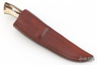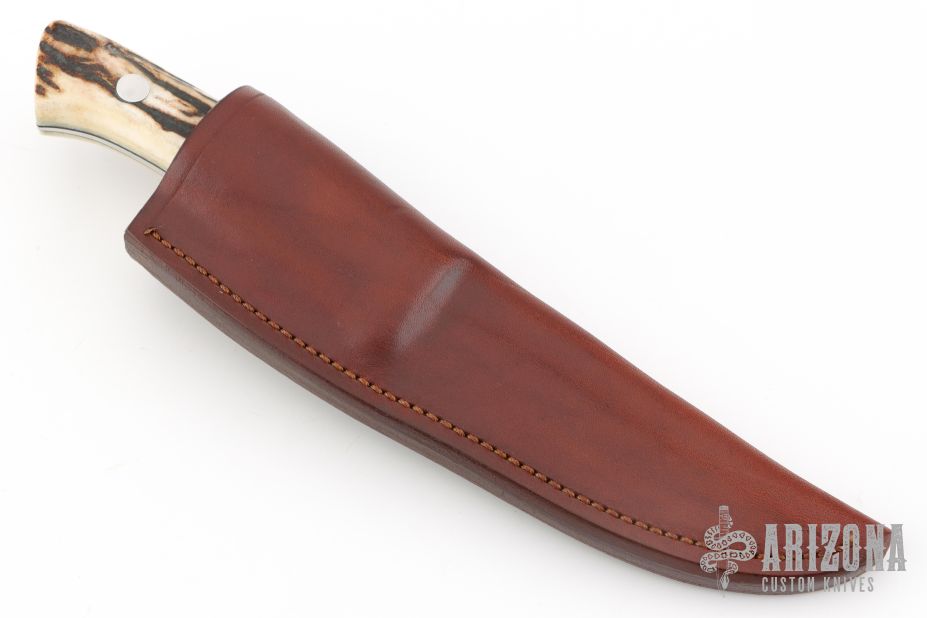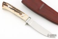 This model 2 Hunter by George Herron features a mirror polished blade with .185" blade stock and .867" blade depth, full tapered tang construction. The handle has a polished stainless steel guard, stag scales with black liners. Marked 1602 on the bottom of the tang. Comes with original sheath and zipper case. Excellent condition.