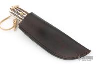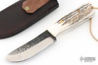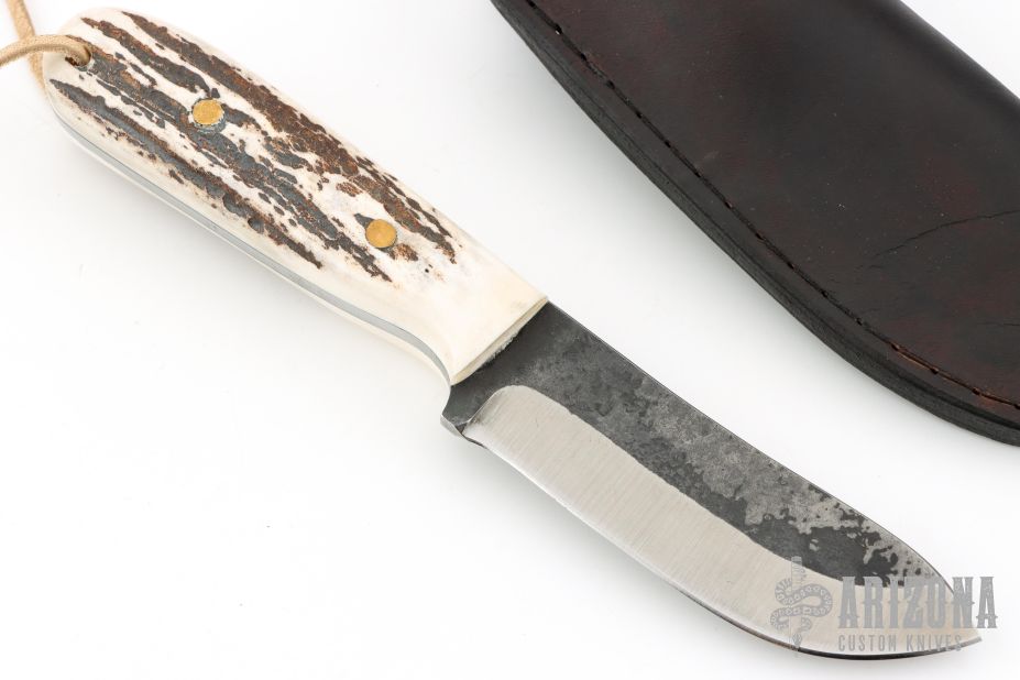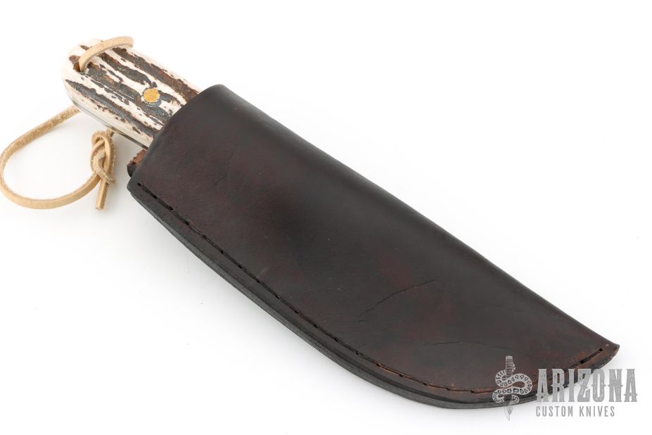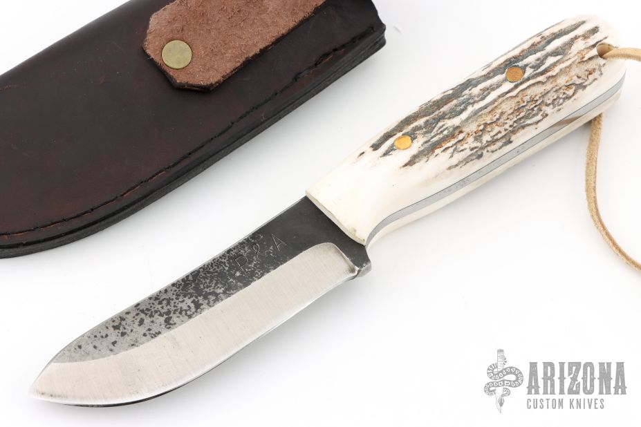 This knife by R&A Knives features a two-tone blade with .177" blade stock and 1.229" blade depth, full tang construction. The handle has stag scales with brass pins. Comes with a brown leather sheath. Excellent condition.