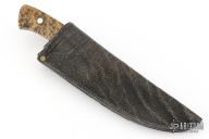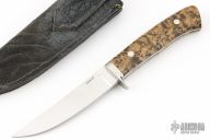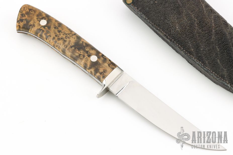 This Model 8 Hunter by the late George Herron features a mirror polished blade with .189" blade stock, .891" blade depth, full tapered tang construction. The handle has a stainless steel guard, burl wood scales with black liners. Numbered 1069 on tang. Comes with a leather sheath and zipper case. Has some scratches on the blade, great condition otherwise.