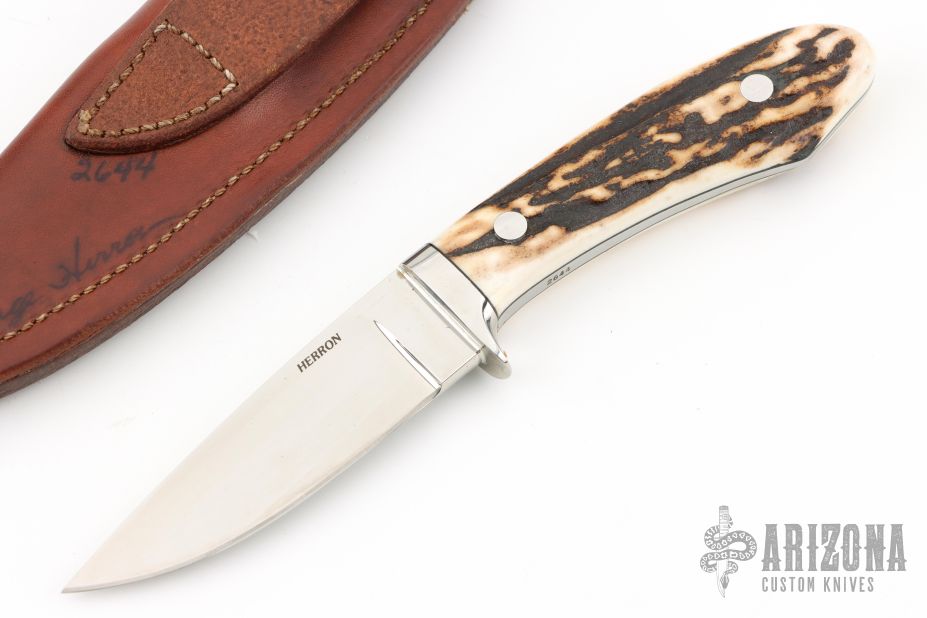 George Herron was a significant player in the custom knife world. He was well known for his exquisitely crafted and designed stock removal knives, he specialized in hunting knives and skinners, he has a significant collector following. He was a past president of the Knifemakers Guild and founded the South Carolina Knifemakers Guild, in 1987 he was inducted into the Blade Cutlery Hall of Fame. George passed away in 2007.