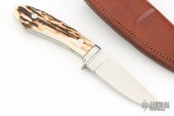 This Skinner by the late George Herron features a mirror finished blade with .185" blade stock and .956" blade depth, full tapered tang construction. The handle has stainless steel guard with stag scales. Comes with original brown leather sheath and zipper case. Excellent condition. #2644