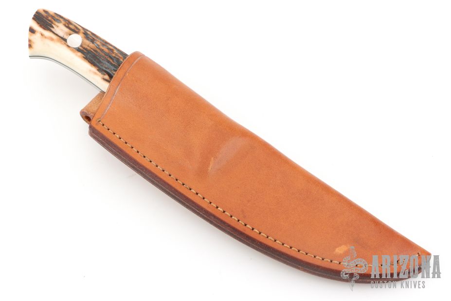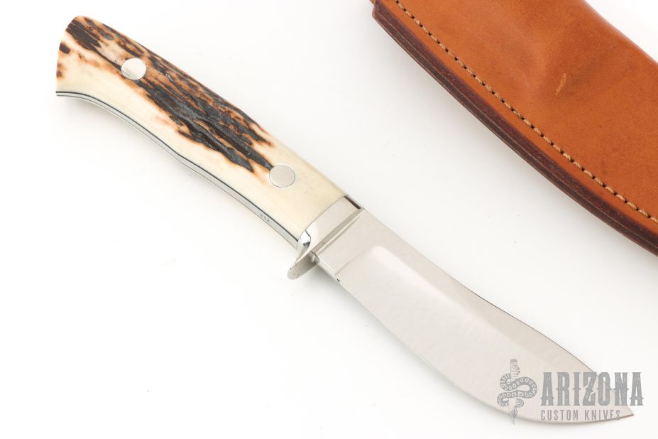 This Semi-Skinner by the late George Herron features a mirror polished upswept blade, .185" blade stock, 1.16" blade depth, full tapered tang construction. The handle has a nickel silver guard, black liners, and stag scales. Numbered 213 on bottom of tang. Includes a brown leather sheath and zipper case. Light spotting is visible around the solders otherwise the knife is in Excellent condition.