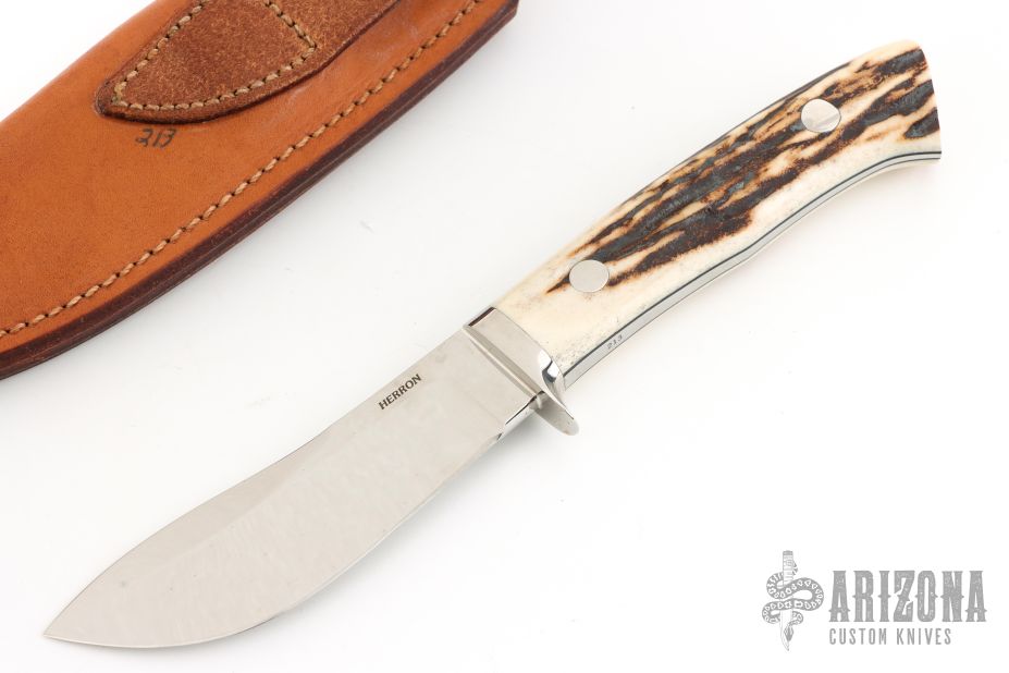 George Herron was a significant player in the custom knife world. He was well known for his exquisitely crafted and designed stock removal knives, he specialized in hunting knives and skinners, he has a significant collector following. He was a past president of the Knifemakers Guild and founded the South Carolina Knifemakers Guild, in 1987 he was inducted into the Blade Cutlery Hall of Fame. George passed away in 2007.