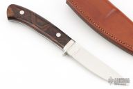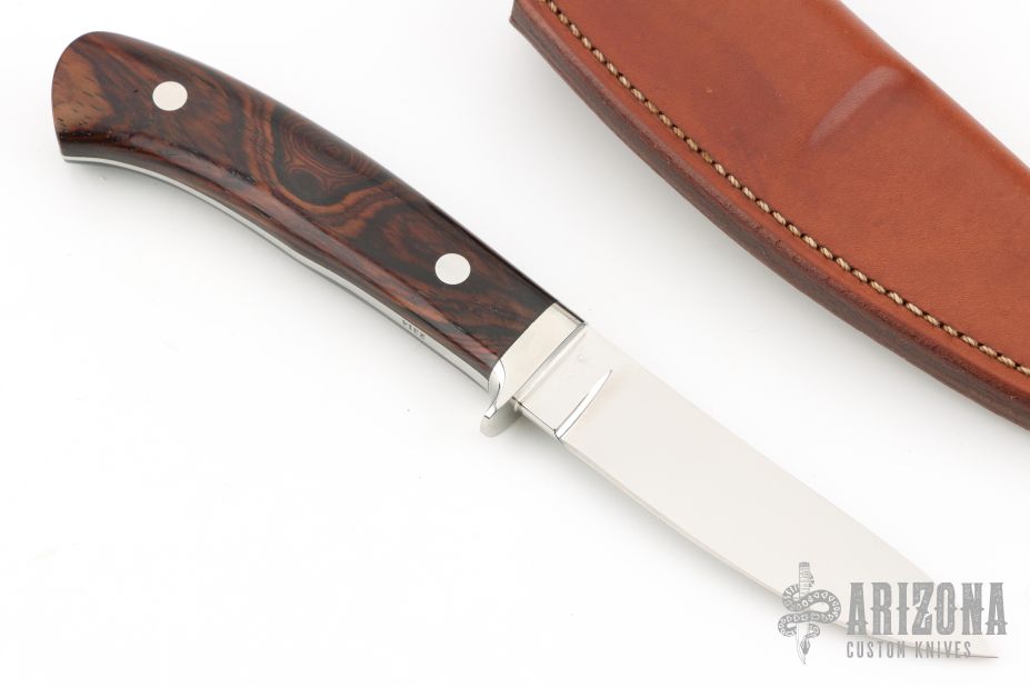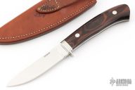 This model 2 Hunter by George Herron features a mirror polished blade with .155" blade stock and .828" blade depth, full tapered tang construction. The handle has a nickel silver guard, wood scales with black liners. Marked 2314 on the bottom of the tang. Comes with matching brown leather sheath and zipper case. Excellent condition.