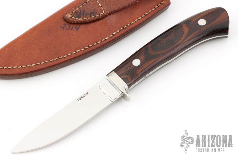 George Herron was a significant player in the custom knife world. He was well known for his exquisitely crafted and designed stock removal knives, he specialized in hunting knives and skinners, he has a significant collector following. He was a past president of the Knifemakers Guild and founded the South Carolina Knifemakers Guild, in 1987 he was inducted into the Blade Cutlery Hall of Fame. George passed away in 2007.