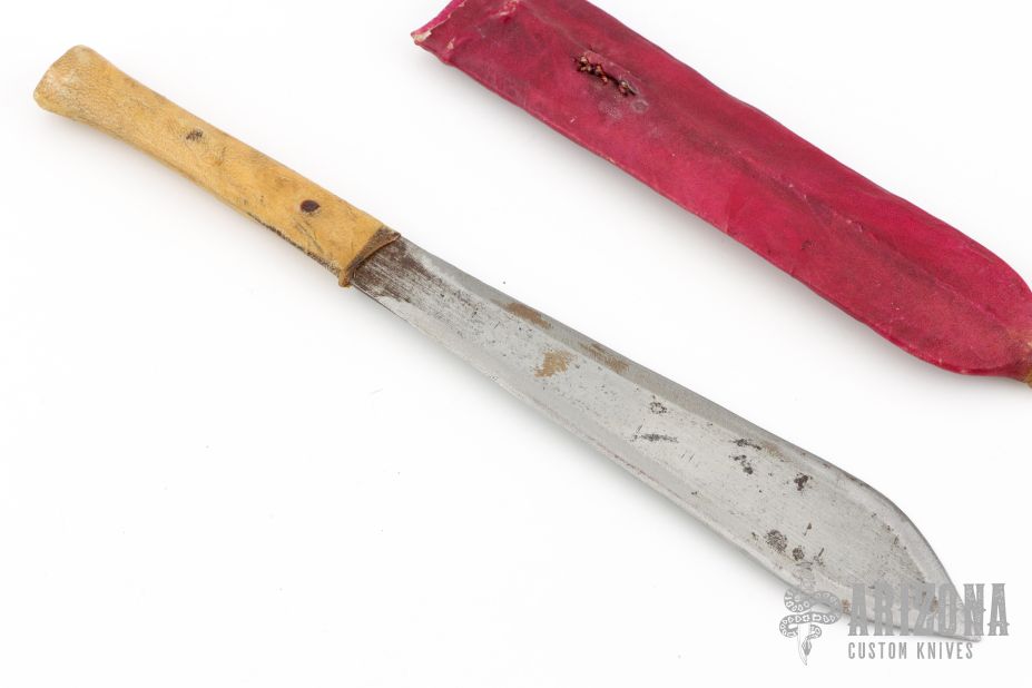 This primitive dagger features a double edged blade, .075" blade stock and 1.461" blade depth, hidden tang construction. The handle is wrapped in rawhide. Comes with a red rawhide sheath. Has some oxidation and scratches, but it has a cool look. good condition for what it is.