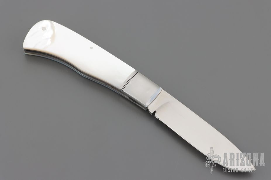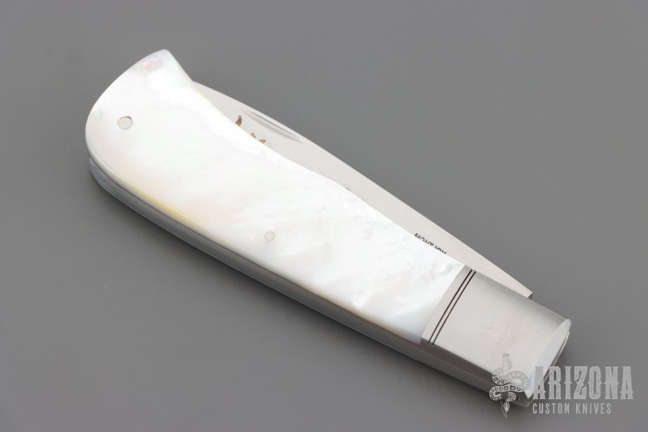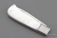 This slipjoint by Claude Montjoy features a hand rub satin finished blade with nail nick. The handle has threaded and dovetailed stainless steel bolsters, mother-of-pearl scales, stainless steel liners and backspacer. Has half-stop. Excellent condition.