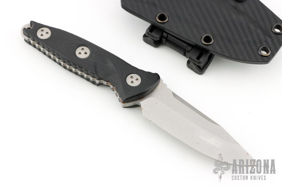 This Mini Socom Alpha by Microtech features a stonewashed clip point blade with a notched thumb ramp and a full tang construction. .169" Blade Stock. 1.178" Blade Depth. The handle features black G10 scales. Includes a kydex sheath. Has some scratches and a couple of small oxidation spots, otherwise good Condition. Dated 08/2020 and #1287