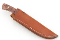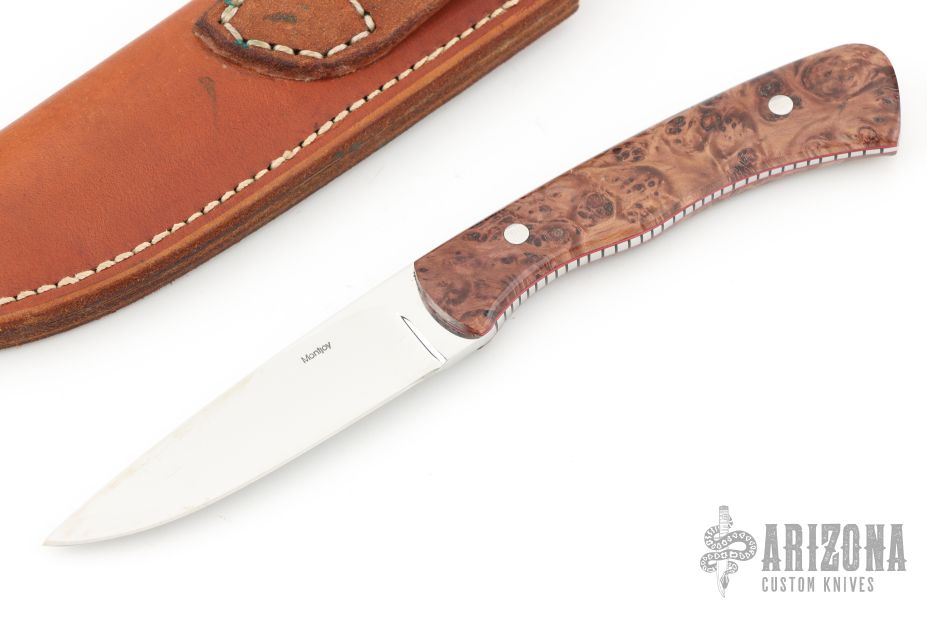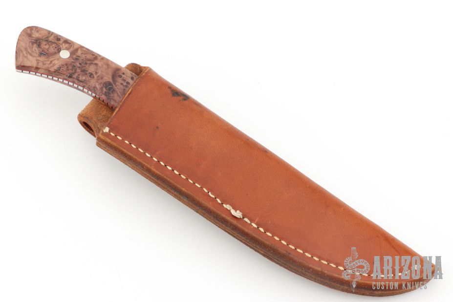 This hunter by Claude Montjoy features a hand rubbed satin finish blade with .127" stock .853" blade depth, full tapered tang construction. The spine and belly are file worked with a coin edge pattern. The handle has pinned burl covers. Comes with leather sheath and a zippered case. Has a few light scratches, otherwise excellent condition.