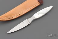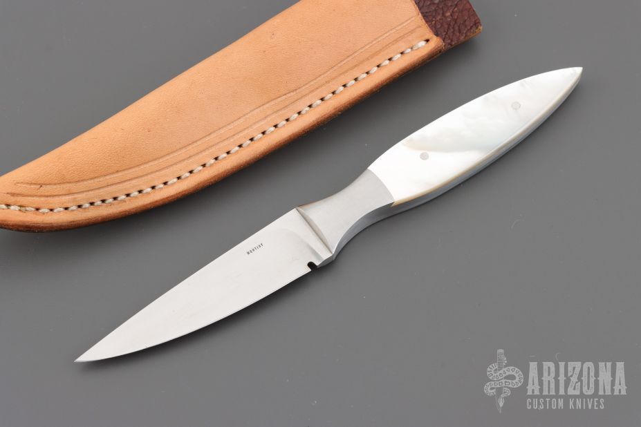 This knife by Claude Montjoy features a hand rubbed satin finish blade with .124" stock .746" blade depth, full tapered tang construction. The handle has steel dovetail bolsters, pinned pearl covers. Comes with leather sheath with clip, and a zippered case. Has a few light scratches, otherwise excellent condition.
