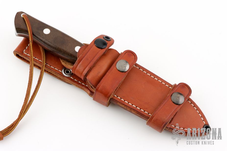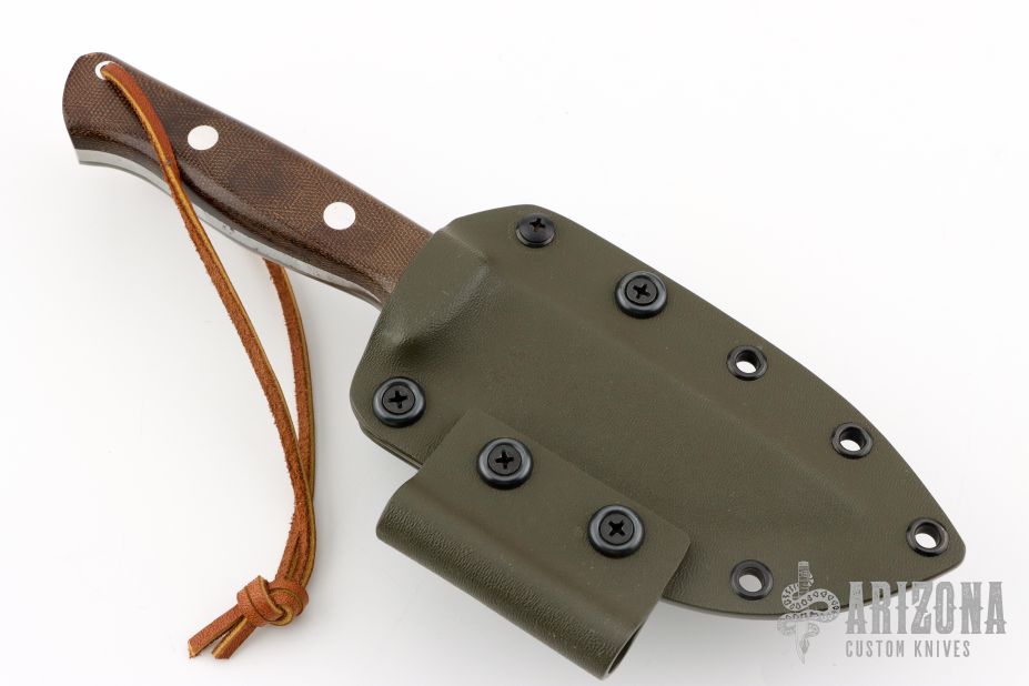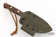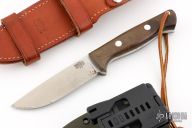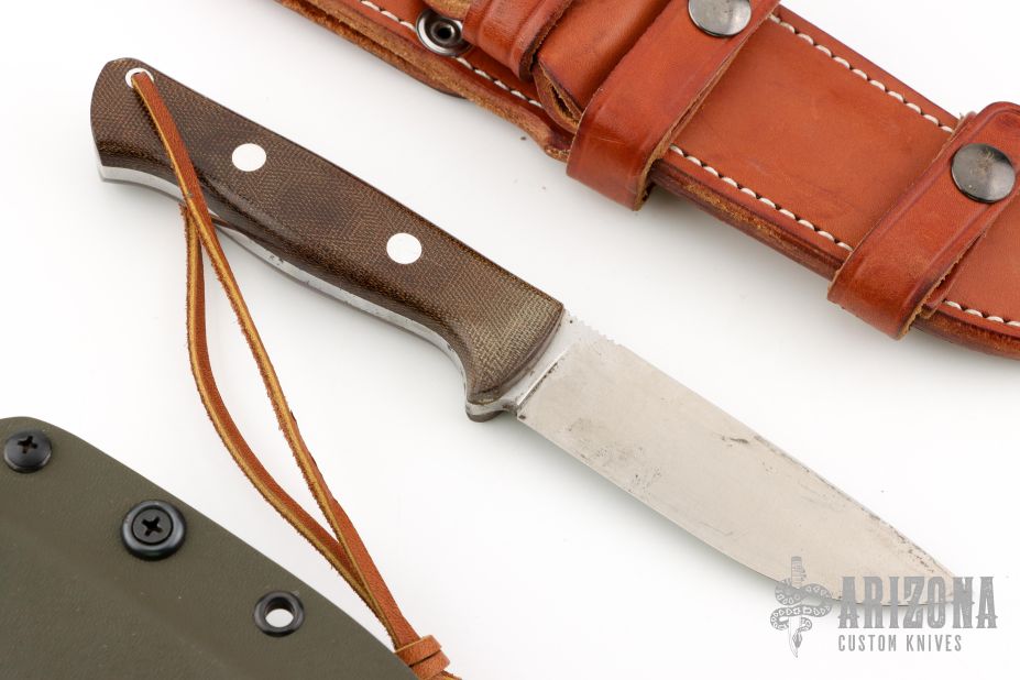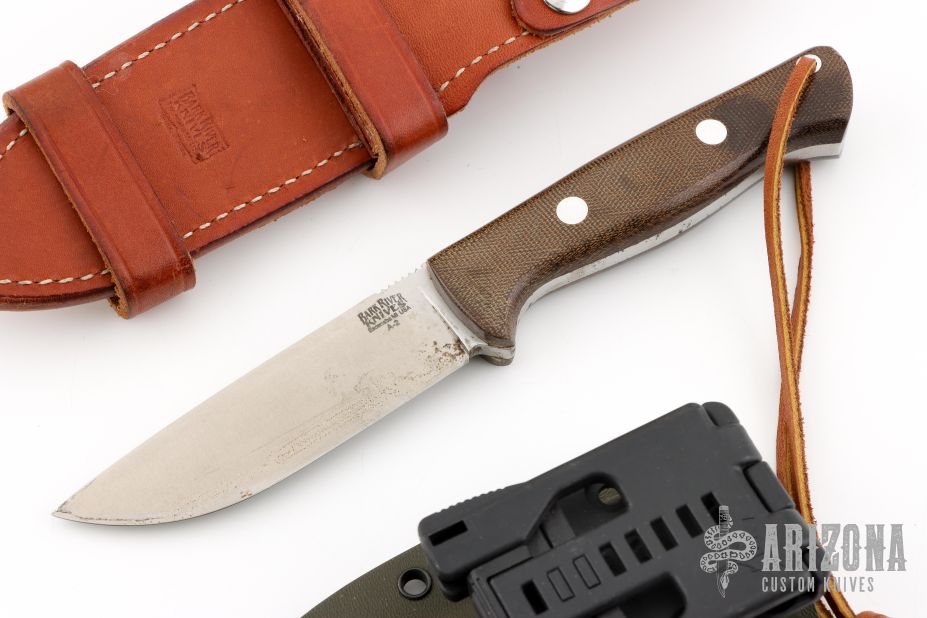 This Field Bravo-1 by Bark River Knives features a satin finished blade with notched thumbrest, .216" blade stock and 1.128" blade depth, full tang construction. The handle has green canvas micarta scales with lanyard hole. Comes with original brown leather sheath, box and papers. Comes with a custom kydex sheath as well. Has scartches and oxidation, otherwise good user condition.