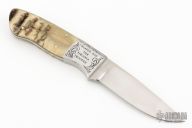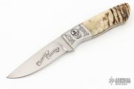 This knife by Claude Montjoy features a hand rubbed satin finish blade with .160" stock 1.152" blade depth, full tapered tang construction. The handle has engraved steel dovetail bolsters, pinned horn covers. Comes in a wood display box with felt lining. Marked 1 of 1 and RO Easler in the finger choil/belly area. Has a couple light scratches, excellent condition otherwise.