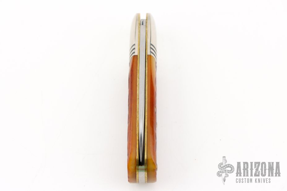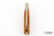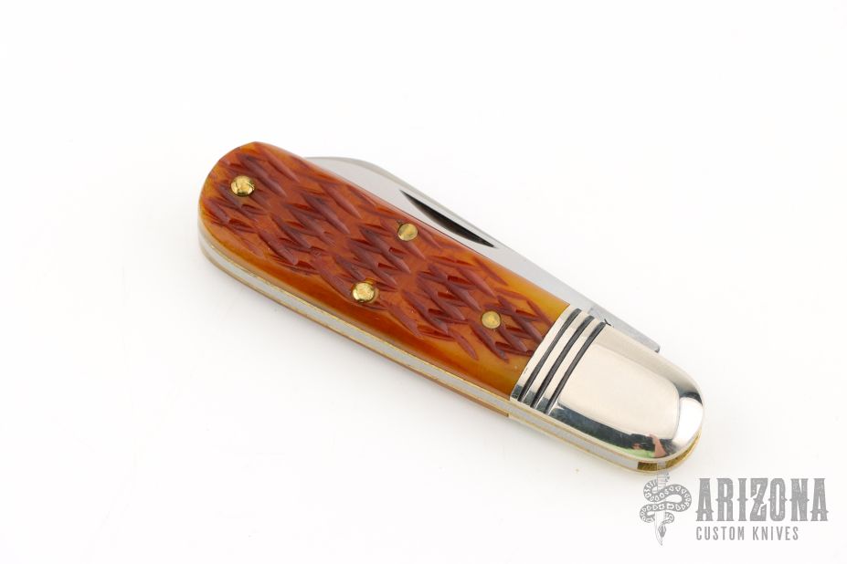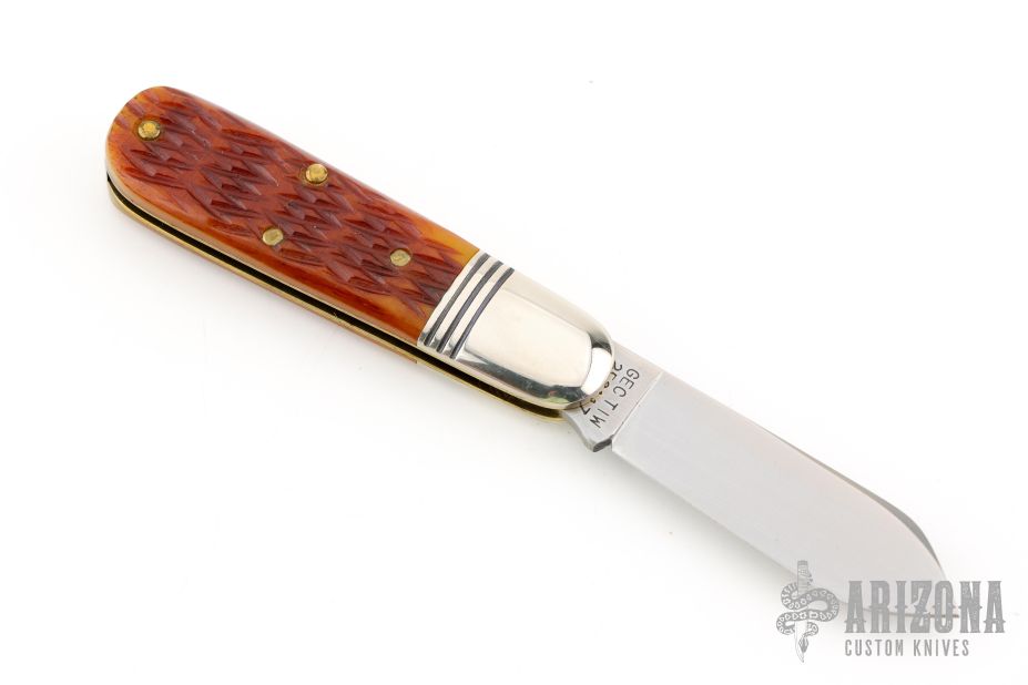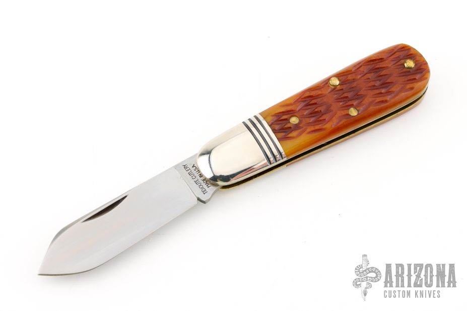 This Little Jack slipjoint by Great Eastern Cutlery features a satin finished blade with nail nick. The handle has nickel silver bolsters, Goldenrod Jigged bone covers, brass liners and a steel spring. Has half-stop. Includes original tube. Excellent condition.