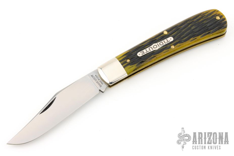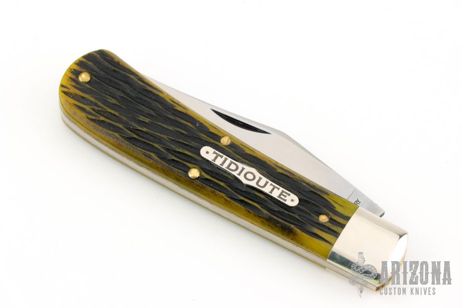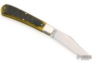 This Stallion by Great Eastern Cutlery features a polished blade with nail nick. The handle has nickel silver bolsters, jig green bone covers with brass liners/pins, steel spring. Has half-stop.  Comes with original tube. Excellent condition.