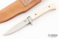 This knife by Ralph Smith features a hand rub satin finished blade with .150" blade stock and .698" blade depth, full tapered tang construction. The handle has a stainless steel guard, mosaic pins and bone scales over red liners. Includes a brown leather sheath and zipper case. Has some light scratches, excellent condition otherwise.