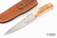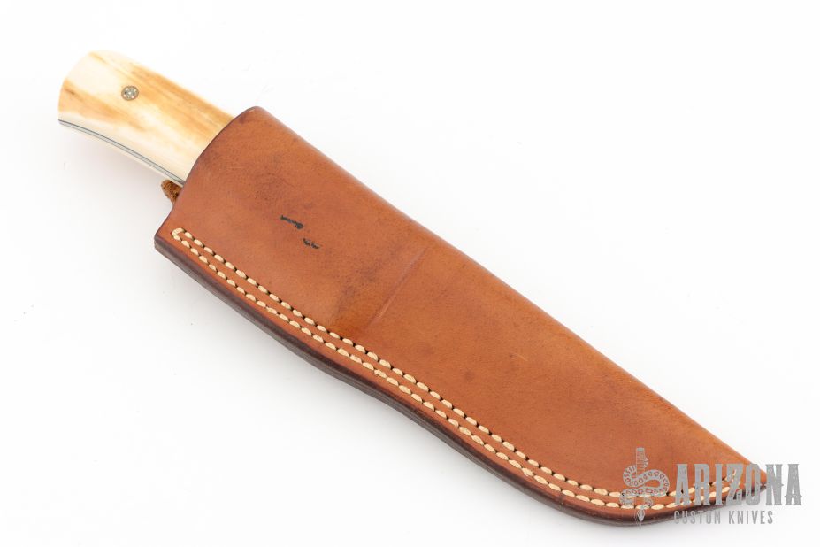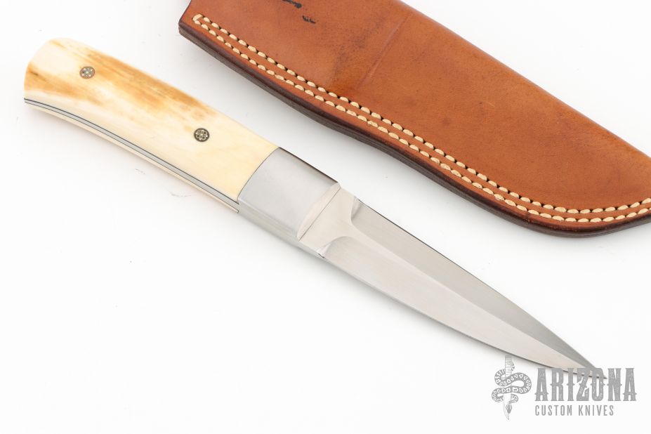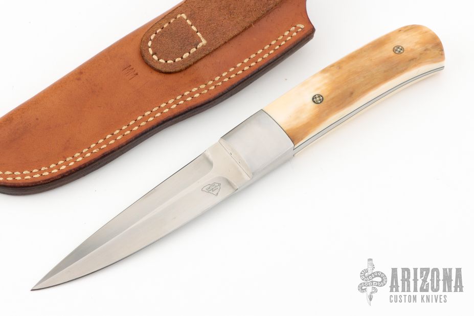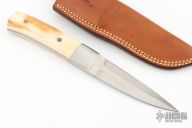 This knife by Ralph Smith features a satin finished double-edged blade with tapered tang construction, .157 blade stock and .969" blade depth. The handle features steel dovetailed bolsters and mammoth scales over black liners.  Includes a brown leather sheath and zipper case.  Light scratches are visible on the bolsters otherwise the knife is in excellent condition.