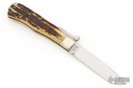This Bullhead leverlock trapper by Great Eastern Cutler features a mirror finished blade with nail nick. The handle has nickel silver bolsters, burnt stag covers with a nickel silver escutcheon, brass liners and pins, steel spring. Comes with original tube. Excellent condition. 40 were made