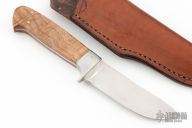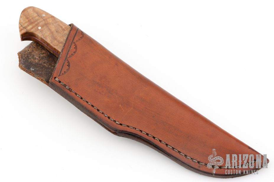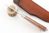 This knife by Ralph Smith features a satin finished trailing point blade with tapered tang construction, .159 blade stock and 1.168" blade depth. The handle features a steel guard, pinned wood grip and red liners. Includes a brown leather sheath and zipper case. Light scratches are visible on the bolsters and there is some rust in the soldering, otherwise the knife is in great condition.