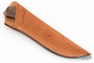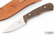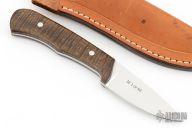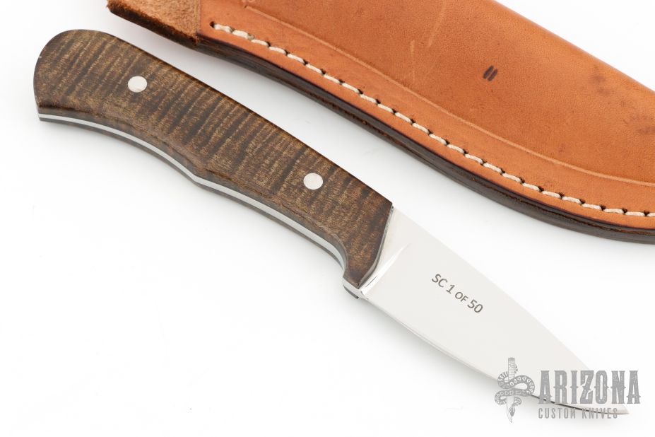This knife by Ralph Smith features a hand rub satin finished blade with .152" blade stock and .935" blade depth, full tapered tang construction. The handle has pinned wood covers, and black liners. Includes a brown leather sheath and zipper case. Has some light scratches, excellent condition otherwise. Marked SC 1of50 on the blade.