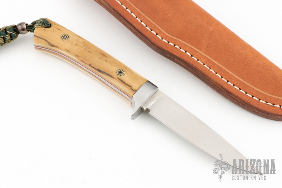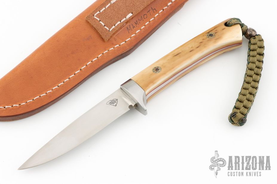 This knife by Ralph Smith features a hand rub satin finished blade with .156" blade stock and .770" blade depth, full tapered tang construction. The handle has a stainless steel guard, mosaic pins and mammoth scales over red liners. Lanyard in lanyard hole. Includes a brown leather sheath and zipper case. Has some light scratches, excellent condition otherwise.