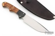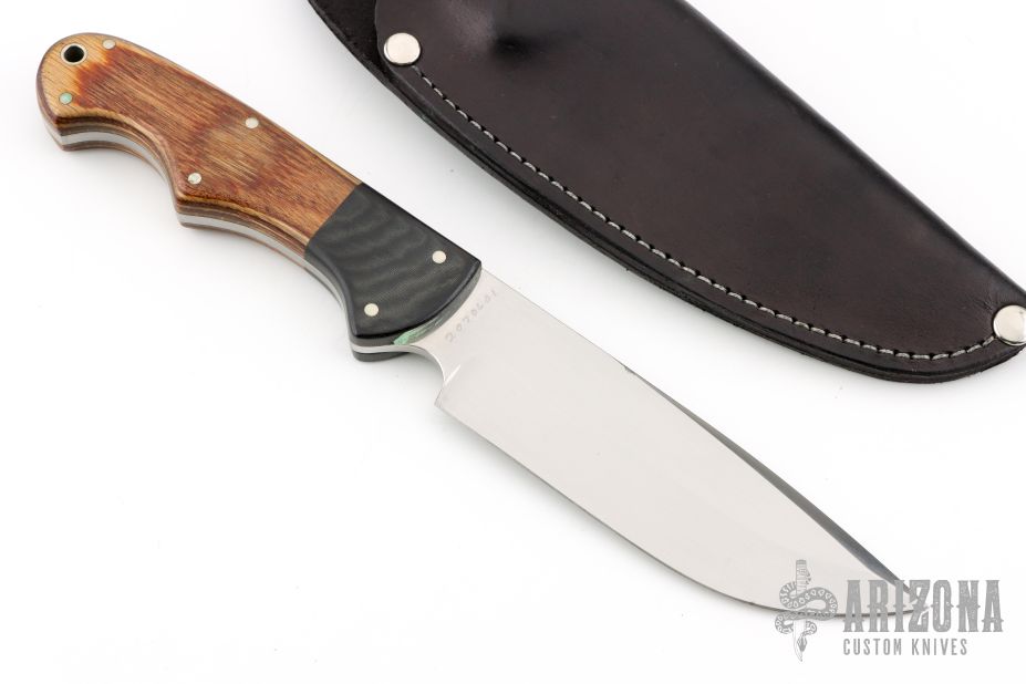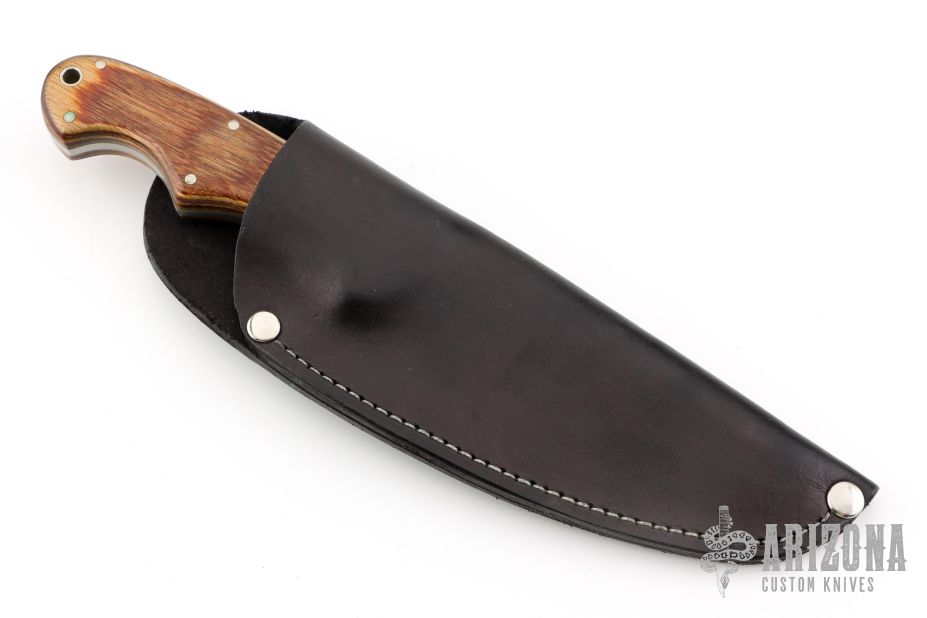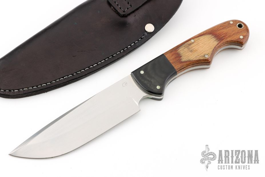 This knife has a makers mark that is a "C" around an "H". Please let us know if you know who this maker is. It features a satin finished blade with false top edge, .154" blade stock and 1.388" blade depth, full tang construction. The handle has black linen micarta bolsters, dymondwood scales with nickel silver pins and a lanyard hole. Comes with a black leather sheath. Has some light scratches, otherwise excellent condition. #2070601 on the blade.