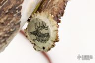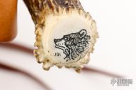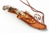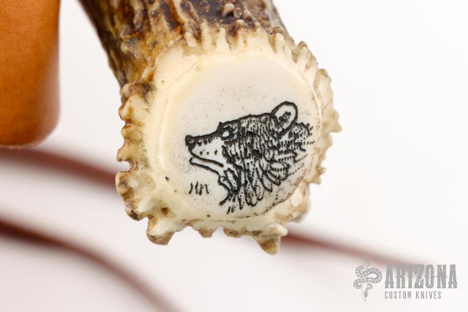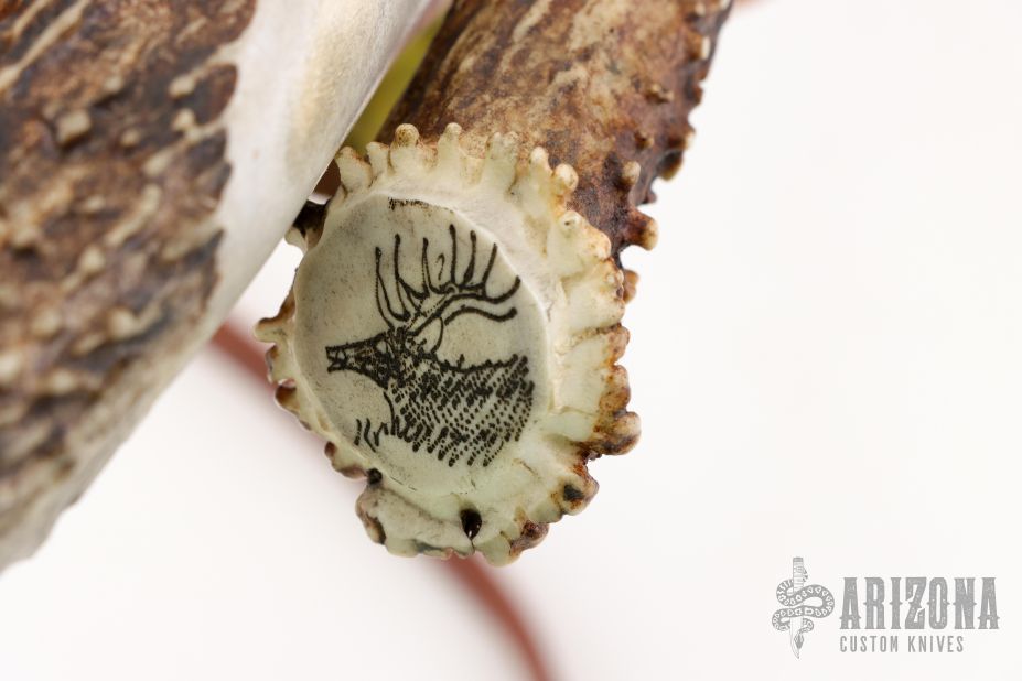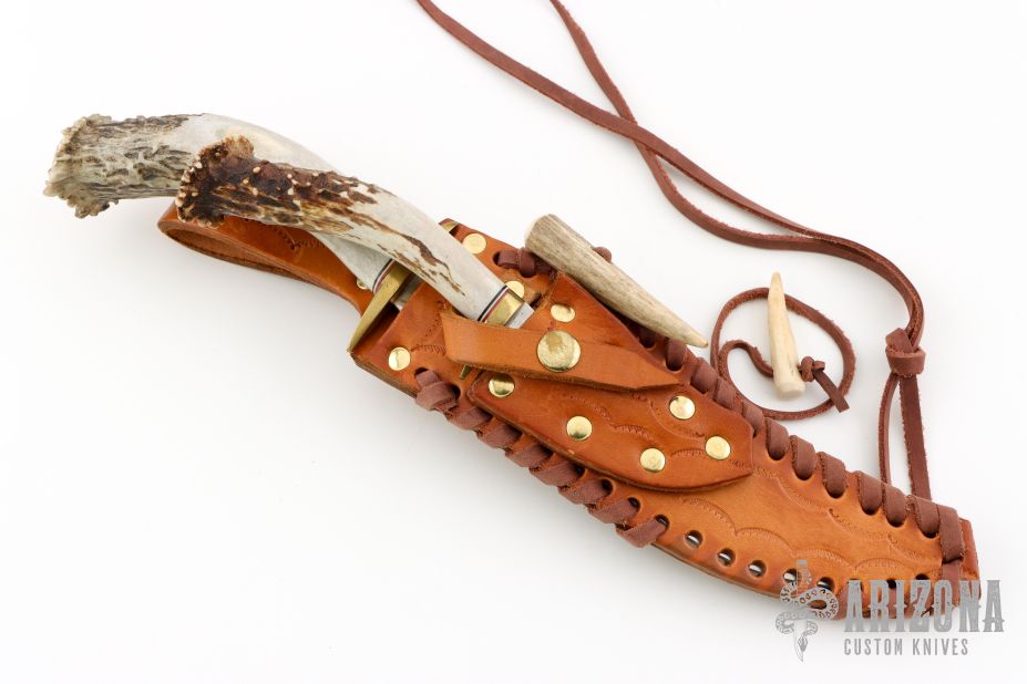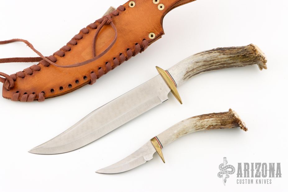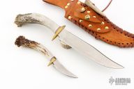This Bowie/Hunter Set by Ken Richardson features a satin finished blade with jeweled flats and satin grinds, .095" blade stock and 1.491" blade depth, hidden tang construction. The handle has a brass guard and crown stag grip, red/white/black spacers. The smaller knife has a satin finished blade with with jeweled flats and satin grinds, .095" blade stock and .903" blade depth, hidden tang construction. The handle has a crown stag grip. Comes with a brown leather sheath that holds both knives. Has some light scratches, otherwise excellent condition. both has scrimshaw on the butts.