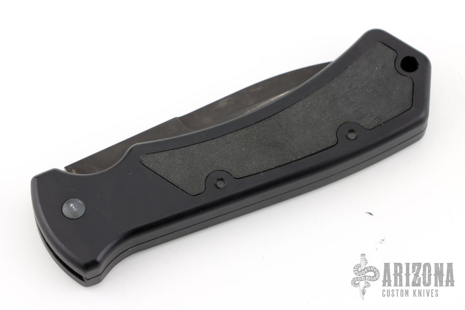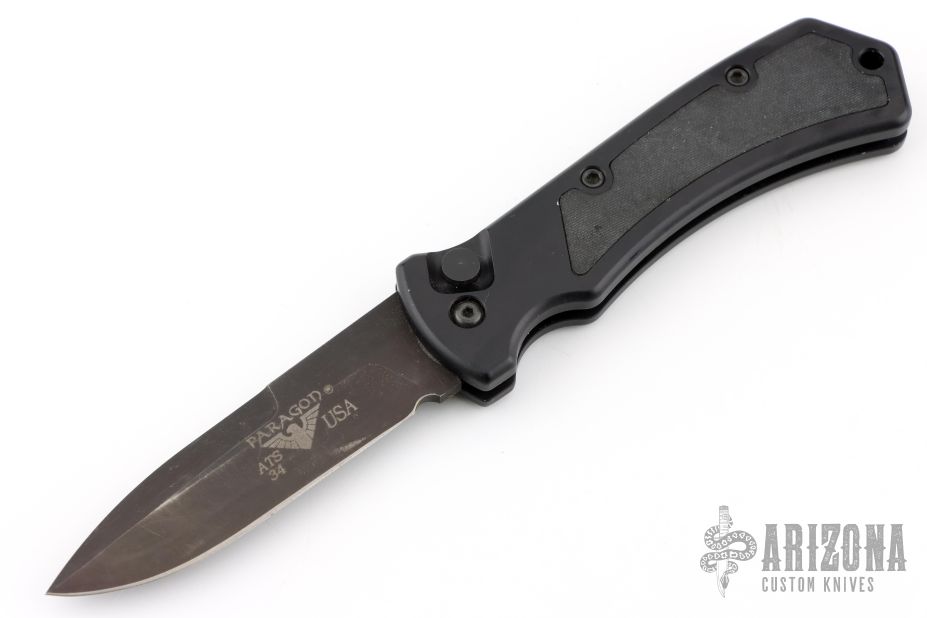 This ATKO 2 from Paragon features a black blade with false top edge. Black anodized frame with non-slip inlays. Comes with original box. Has some scuffs and scratches, good condition otherwise.