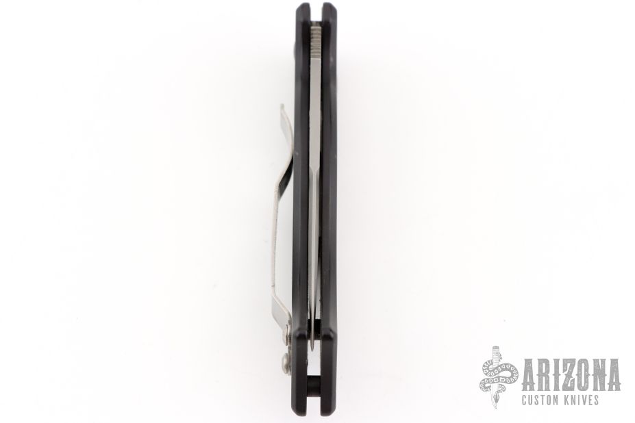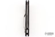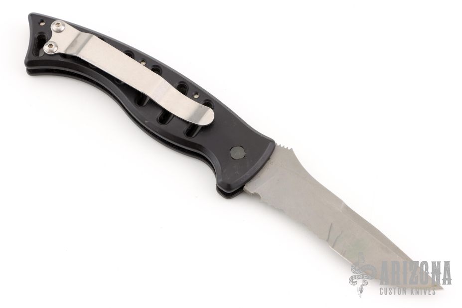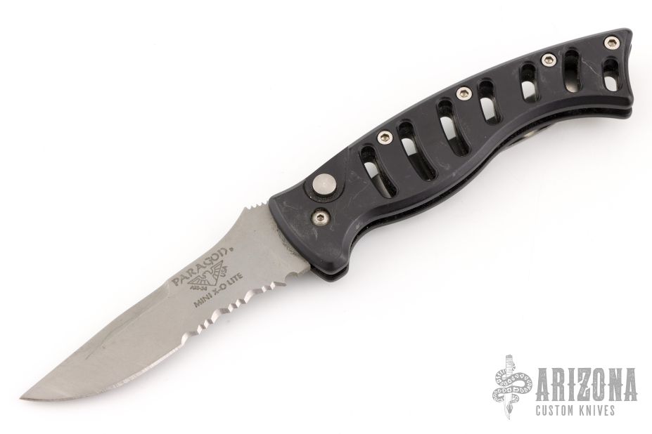 This Paragon Mini X-O Lite auto has a blasted recurve partially serrated blade with notched thumbrest and false top edge. Handle is black anodized aluminum with tip up clip. Comes in a PVK nylon belt sheath. Has some scuffs and scratches, otherwise good condition.