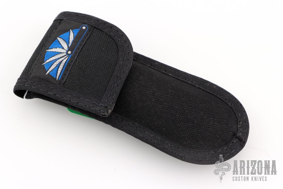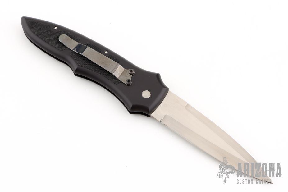 This Cobra side-opening automatic is from the custom series and features a hand ground hand rub satin finished blade by Harold Corby. Coil spring. Sliding safety. Black aluminum handle with rubber inserts, tip down black stainless steel clip. #938 on the blade. Comes in a PVK nylon belt sheath. Has some light scuffs, excellent condition otherwise.
