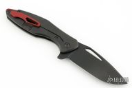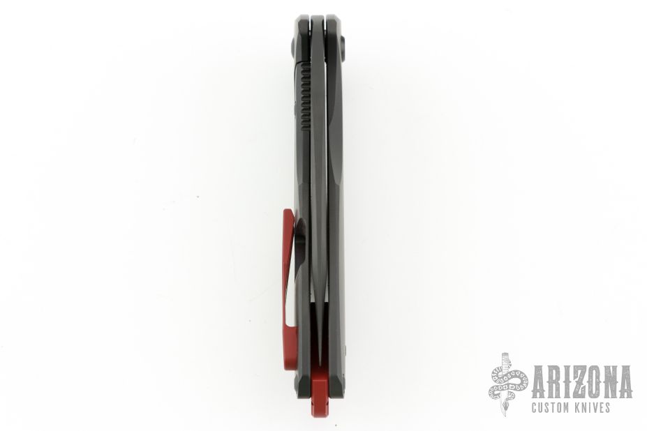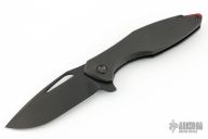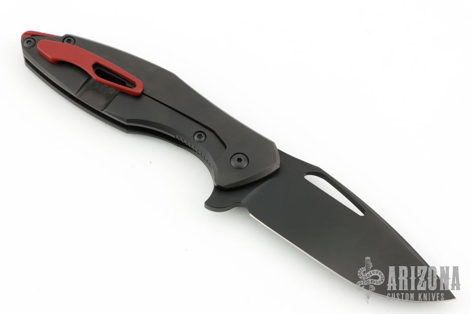 This Arius by Koenig knives features a blade with DLC finish, thumbhole and flipper. The handle has a nicely milled DLC titanium frame with a red titanium tip up clip, black titanium hardware and red titanium backspacer. Has ceramic bearings and a ceramic detent ball. Nice detent, lockup and blade seating. Comes with original box and COA Dated 12/30/17. Excellent condition.