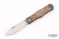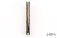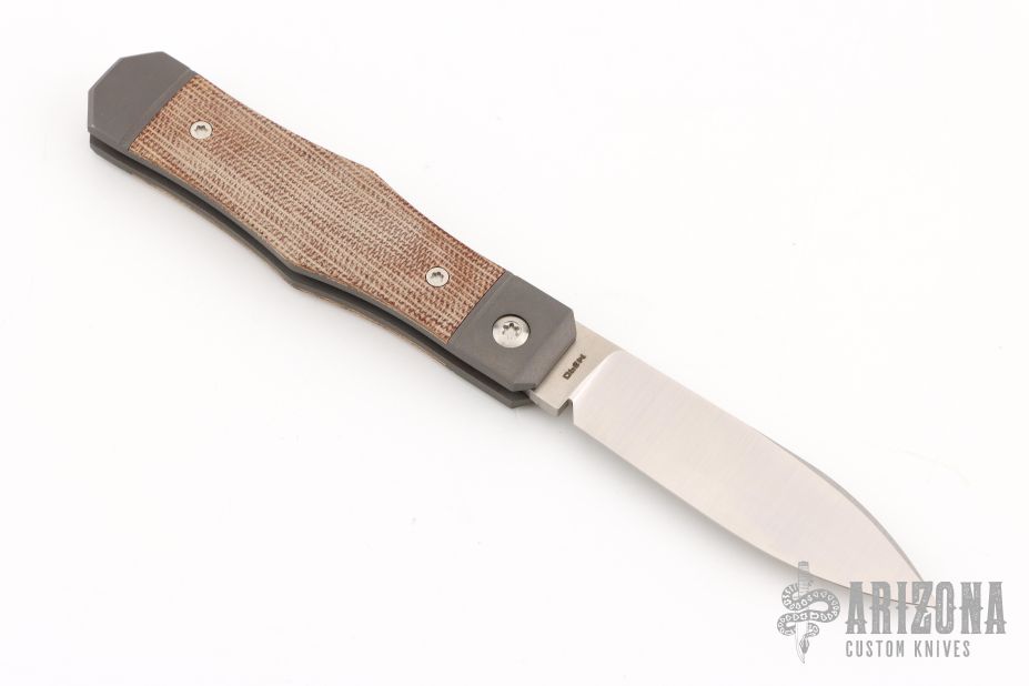 This Vampire Jack (Coffin) slipjoint model by Jack Wolf Knives features a satin finished drop point blade with nailnick. The handle has integral bead blast finish pinched and fluted titanium front and rear bolsters and liners, Micarta scales with a stainless spring. Comes with box, metallic tube with Sean Tiffany artwork, leather slip, sticker and microfiber cleaning cloth. Excellent condition.