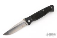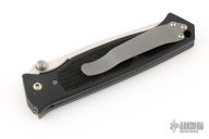 This Vallotton Chameleon D/A has a clip point satin finished blade with dual thumb studs and notched thumb rest. Handle is black FRN composite scales with rubber inlay, stainless steel liners and tip up clip. This knife has a hidden button under the rubber inlay on the A-side. Has some light scuffs and scratches, otherwise excellent condition. #9678