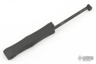 This Nemesis III by Microtech Knives features a satin finished double edged blade with fullers. The handle has a black aluminum frame with safety and charging handle. Dated 10/1998. Comes with original box, and papers. Has a couple light scuffs, otherwise Excellent condition.