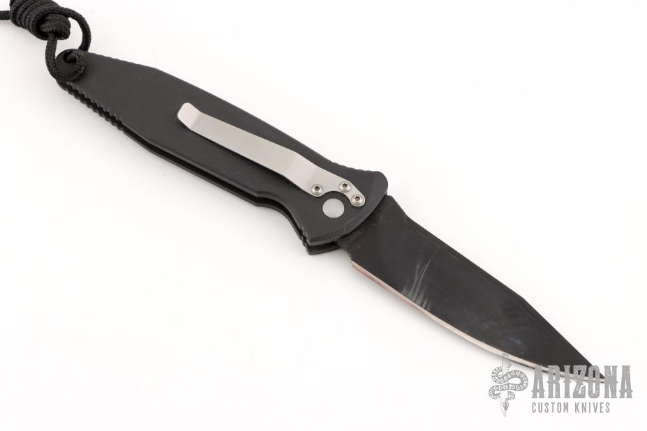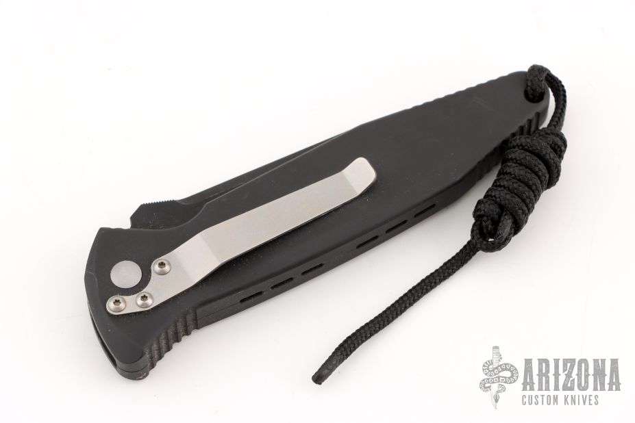 This Mini Socom Auto (2/99) has a black coated 154-CM stainless steel tanto blade. Handle is black aluminum with non-slip inserts, lanyard, and bead blasted titanium tip down clip. Comes with original box, papers, and nylon belt sheath. Has scuffs and scratches throughout, good condition; great user condition otherwise.