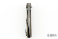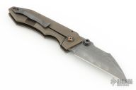 This Nightshade by Jonathan McNees is a JVO Design. It features a San Mai Damascus wharncliffe blade with notched thumbrest and dual zirconium thumbstuds. The handle has a textured and anodized titanium frame with zirconium tip up clip, pivot collars and backspacer. Comes with a McNees patch. Has a couple very light scuffs, otherwise excellent condition.