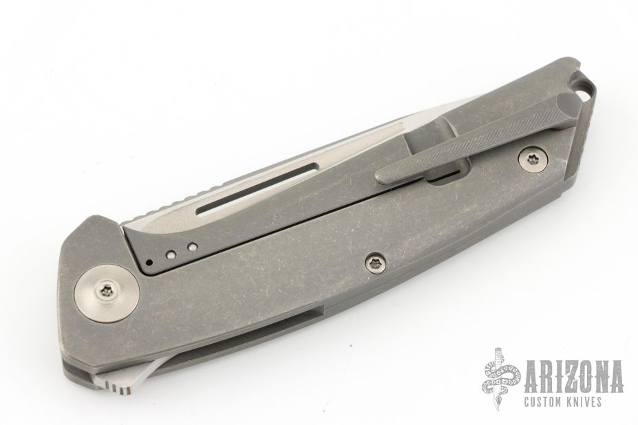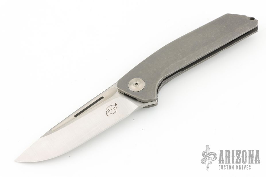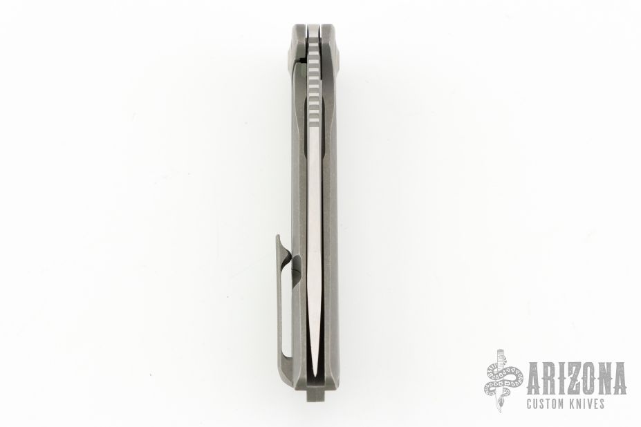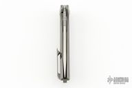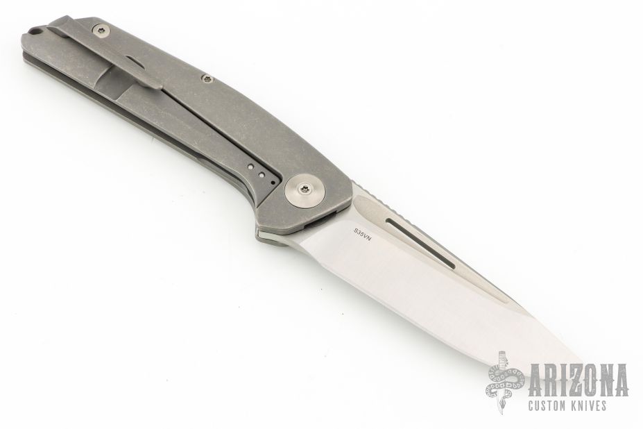 The Endeavour is yet another evolution of a Liong Mah Design superbly executed by Reate Knives. It incorporates a number of innovative features never before seen on a Reate/Mah collaboration. With its super swift/smooth action and utilitarian tactical design, this is one flipper you won't be able to put down. The Endeavour is the first knife to use orange peel textured hardware and a backspacer-less design, both of which were executed perfectly. The 3.75" blade is made from CPM-S35VN stainless steel with hand rubbed satin flats and machine flat ground satin bevels. Liong has the steel shipped all the way from Speciality Metals in Texas to China and back again. This ensures the best quality steel is used and that each piece is uniform in terms of grain structure and hardness. The action using the compact flipper tab or 3D milled slot in the blade is smooth and authoritative, flying out of the blade with the lightest touch. The flipper tab disappears into the frame when deployed which is always a nice touch. You have perfectly executed jimping on the thumb ramp and a finger choil for choking up on for fine detail work. The handles are made from two half-inch billets of titanium with contoured edges, internal lightening pockets, and a very ergonomic shape. The backspacer is integrated into each half of the handle and it incorporates a lanyard hole and jimped thumb ramp in the reverse grip. This design gives the presentation side of the knife a very clean look with only a pivot screw holding everything together. The clip also starts as a half inch billet of titanium and instead of inserting a ball bearing in the front, like a Begg-style clip, David's team milled a ball out of the titanium so it functions very similarly. The clip is blind screwed from the interior of the frame, keeping with the hidden hardware theme of the Endeavour design. It is a fantastic overall knife and one that we love everything about, get one while you can. Specifications Blade Length: 3.75" Cutting Edge: 3.625" Closed Length: 5.0" Overall Length: 8.75" Blade Material: CPM-S35VN Stainless Steel Blade Thickness: 0.157" Blade Style: Drop Point Blade Grind: Flat Blade Finish: Satin Handle Material: Contoured Bead Blasted Titanium, Bronze Handle Thickness: 0.53" Locking Mechanism: Frame Pivot Assembly: Bearings Pocket Clip: Milled Titanium (Tip Up, Right Carry) Weight: 5.3 oz. Designer: Liong Mah Made by Reate Knives in China Comes with original zippered case. Excellent condition.
