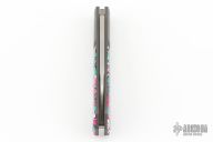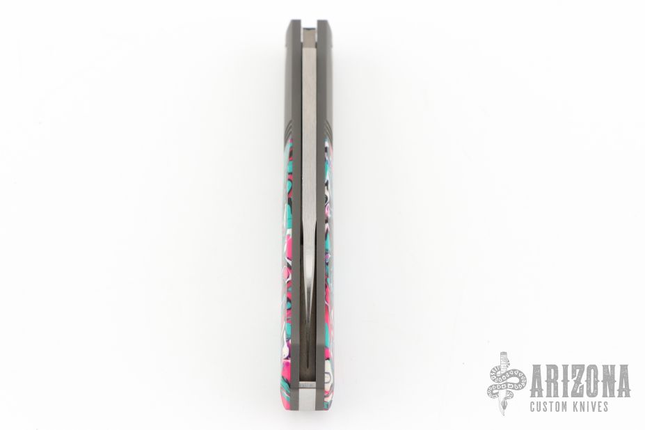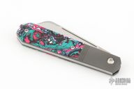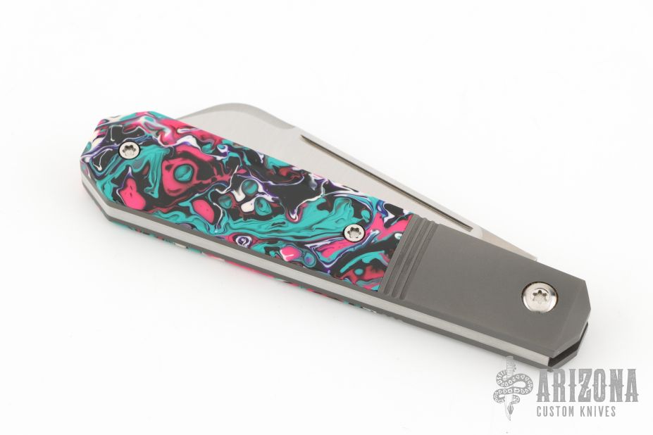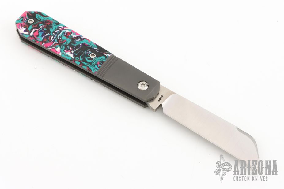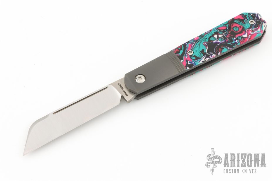 This Midnight Jack is a Barlow (Coffin) slipjoint model by Jack Wolf Knives featuring a belt satin finished sheepsfoot blade with longpull. The handle has integral bead blast finish pinched and fluted titanium front and rear bolsters and liners, Kaotic Resin scales with a stainless spring. Comes with box, metallic tube with J.Gonzo artwork, leather slip, sticker and microfiber cleaning cloth. Excellent condition.