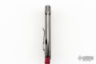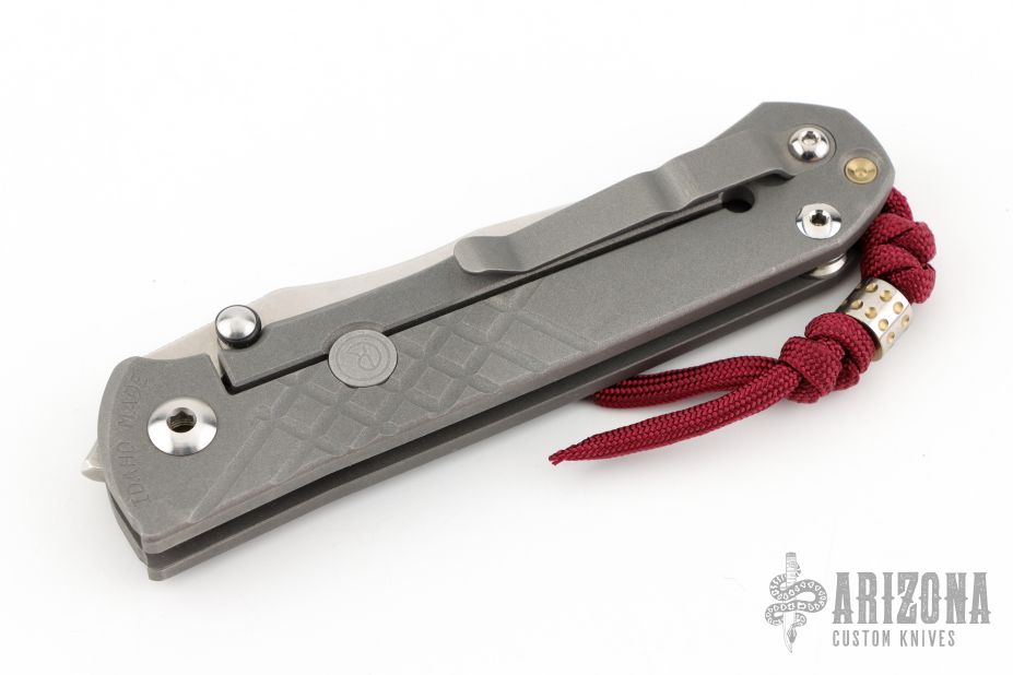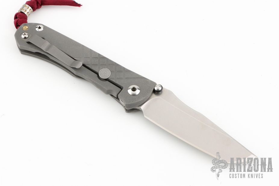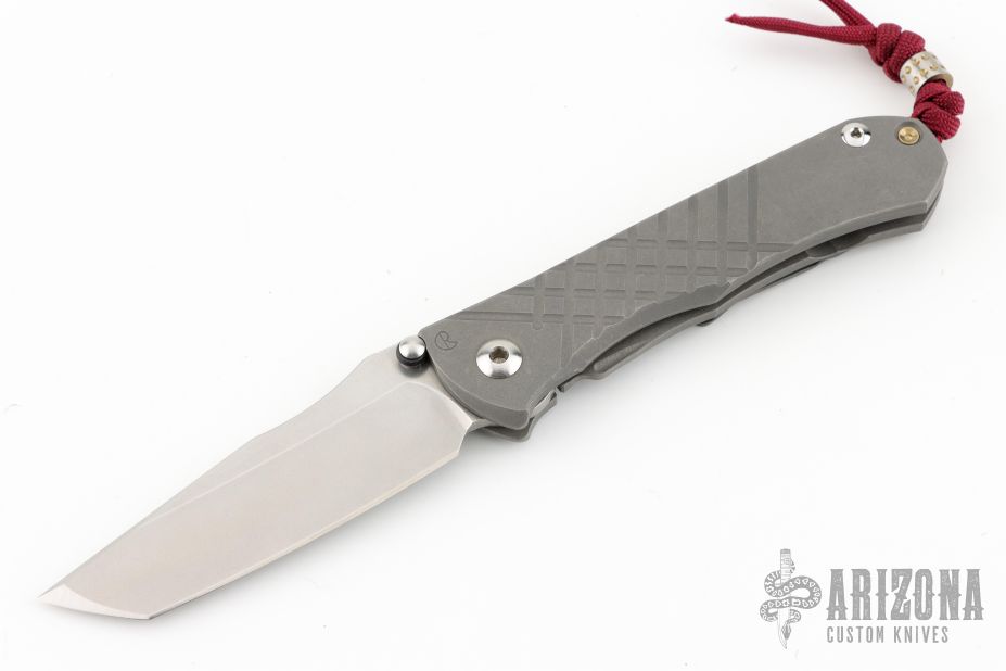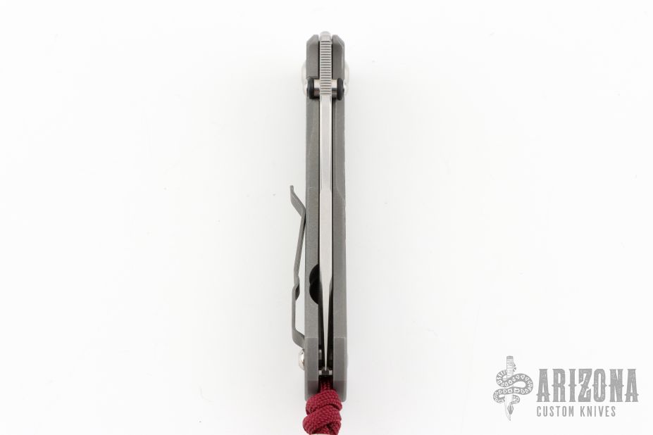 This Unumzaan from Chris Reeve Knives features a stonewash finished tanto blade with dual thumb studs and notched thumbrest. The handle is comprised of blasted and milled titanium with matching tip up clip. Lanyard pin with lanyard and spacer bead in pommel. Comes with original box, papers, cloth, lube and tool and COA dated September 25, 2023. Has scuffs and scratches throughout, good condition; great user condition otherwise.