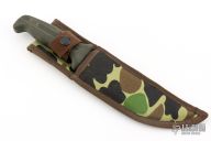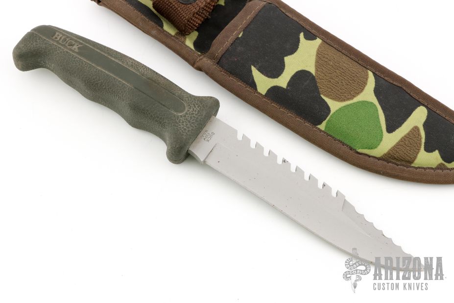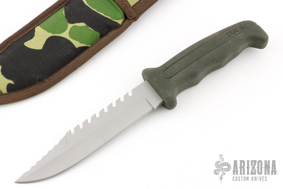 This Model 639 by Buck features a matte finished blade with serrated top edge and sawteeth, .179" blade stock and 1.121" blade depth, hidden tang construction. The handle is rubber. Comes with a camo nylon sheath. Has some small spots on the blade, otherwise excellent condition.