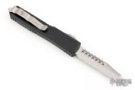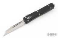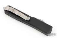 This Ultratech by Microtech Knives features a stonewashed Warhound blade with satin flats and false top edge. The handle has a black aluminum frame with tip down blasted stainless steel clip and hardware. 10/2022, S/N 578. Excellent condition.