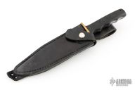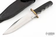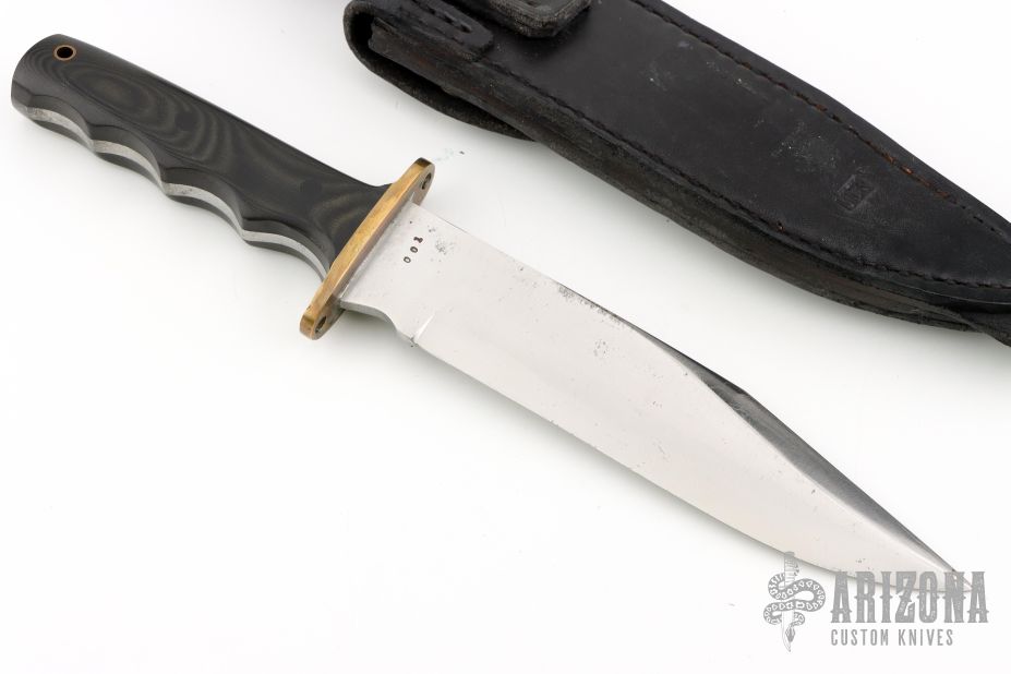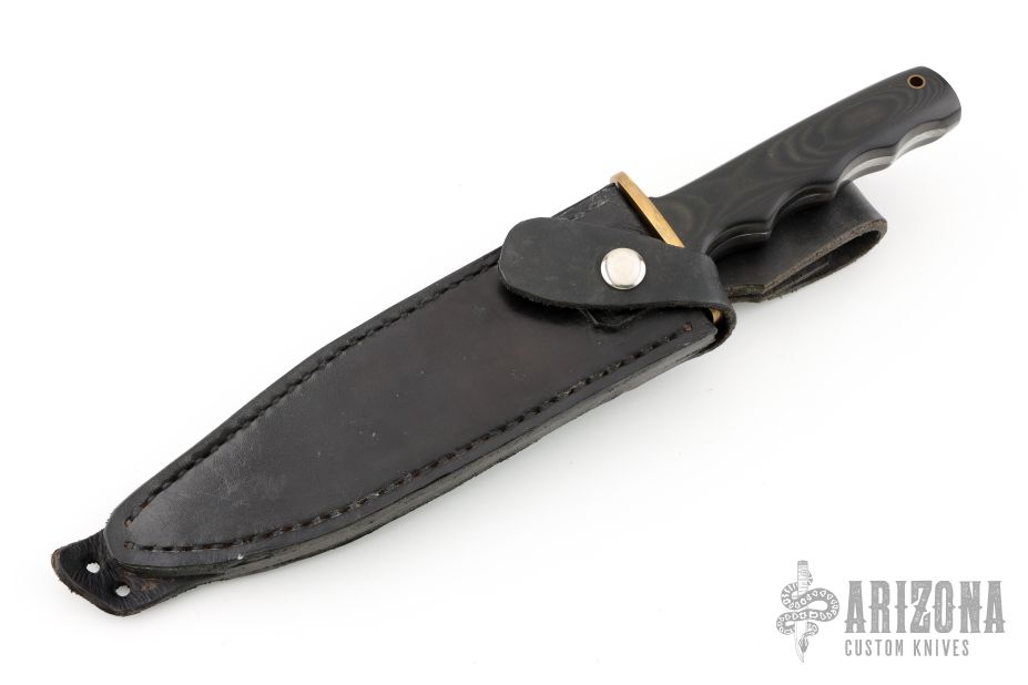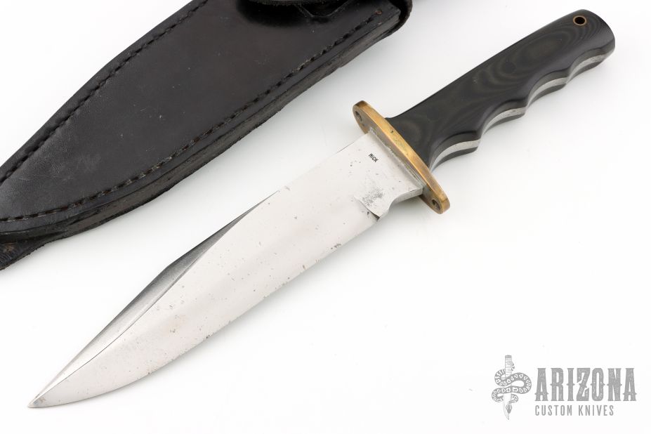 This Fighter by MICK (please let us know if you know this makers full name) features a satin finished blade with sharpened top edge, .239" blade stock and 1.501" blade depth, full tang construction. The handle has a brass guard with black linen micarta scales, lanyard hole at butt. Comes with a black leather sheath. #001 on the blade. Has some scratches and oxidation spots, otherwise good condition.