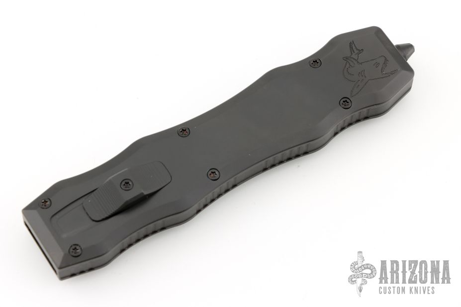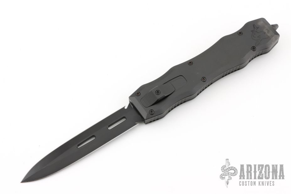 This Brand New Sand Shark OTF double action automatic by Desert Knife Works features a DLC finished double edge blade and a DLC 420 stainless steel handle with matching tip down clip. Comes with original tube and soft pouch. Excellent condition.