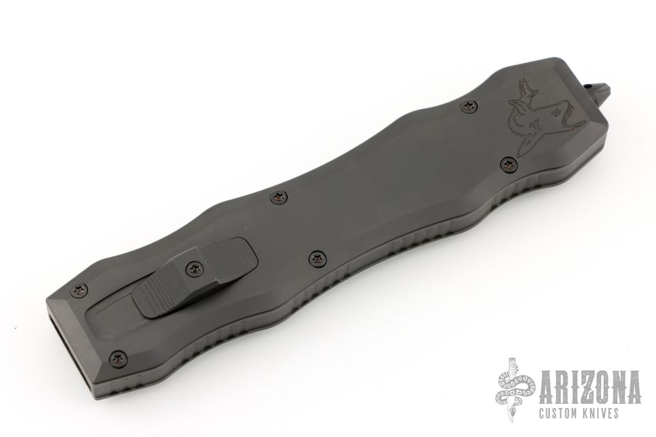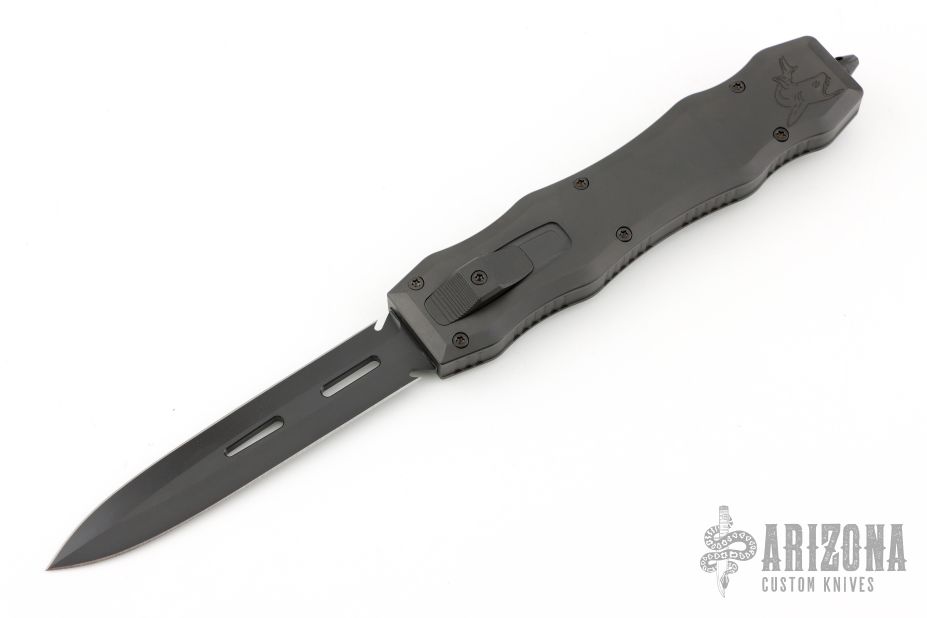 This Brand New Sand Shark OTF double action automatic by Desert Knife Works features a DLC finished double edge blade and a DLC 420 stainless steel handle with matching tip down clip. Comes with original tube and soft pouch. Excellent condition.
