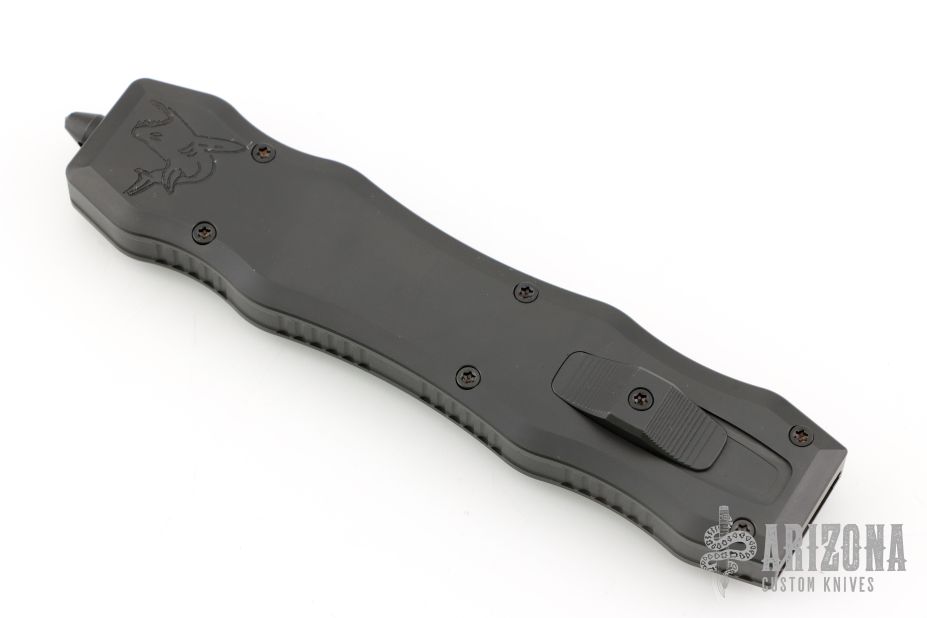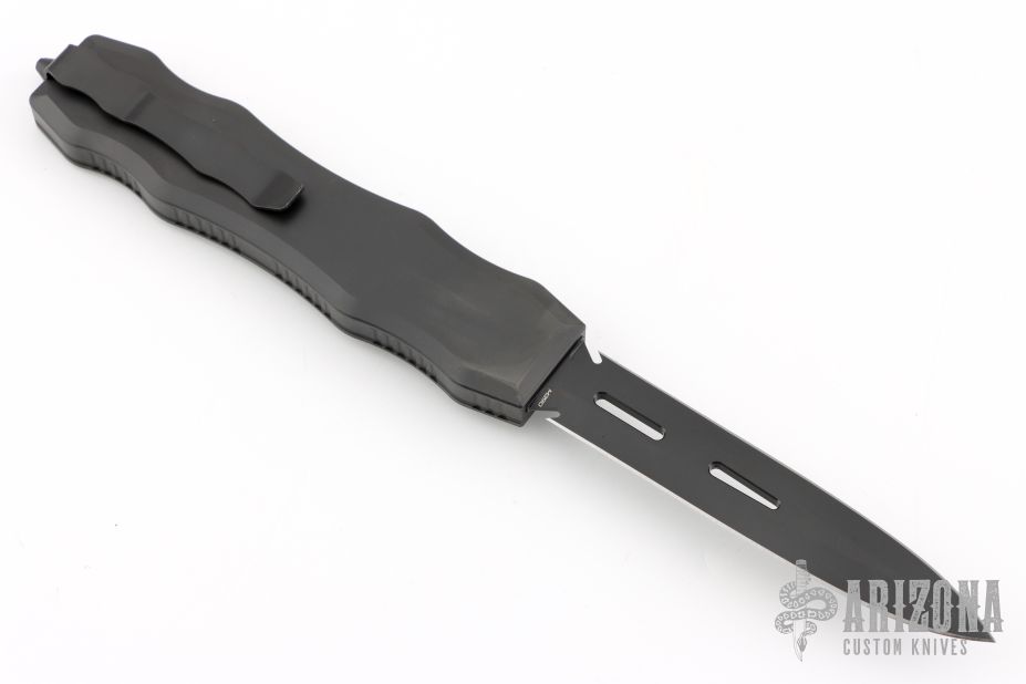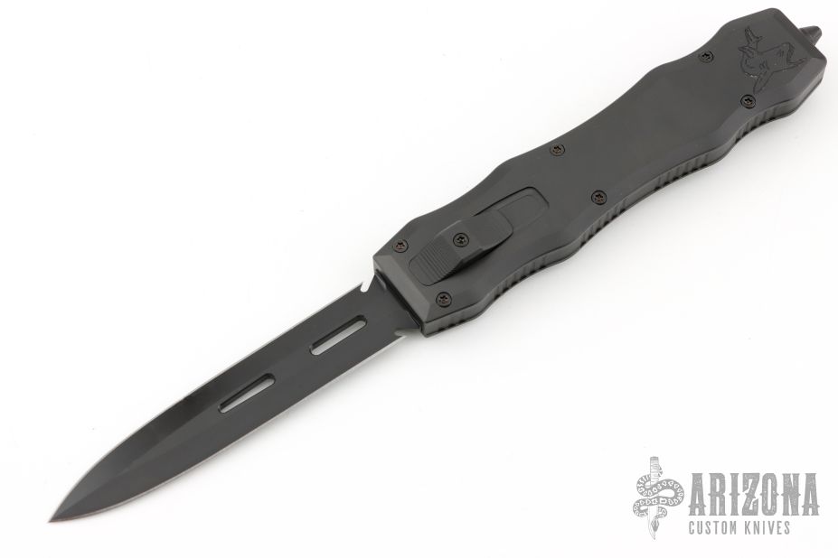 This Brand New Sand Shark OTF double action automatic by Desert Knife Works features a DLC finished double edge blade and a DLC 420 stainless steel handle with matching tip down clip. Comes with original tube and soft pouch. Excellent condition.