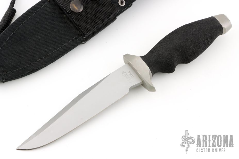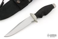 This Old Stlye LMF Tactical by Gerber features a bead blasted drop point blade with .229" blade stock and 1.233" blade depth, hidden tang construction. The handle has bead blasted stainless steel guard and butt and a rubber handle. Comes with black nylon sheath. S/N 052901. Has a couple light scuffs, excellent condition otherwise.